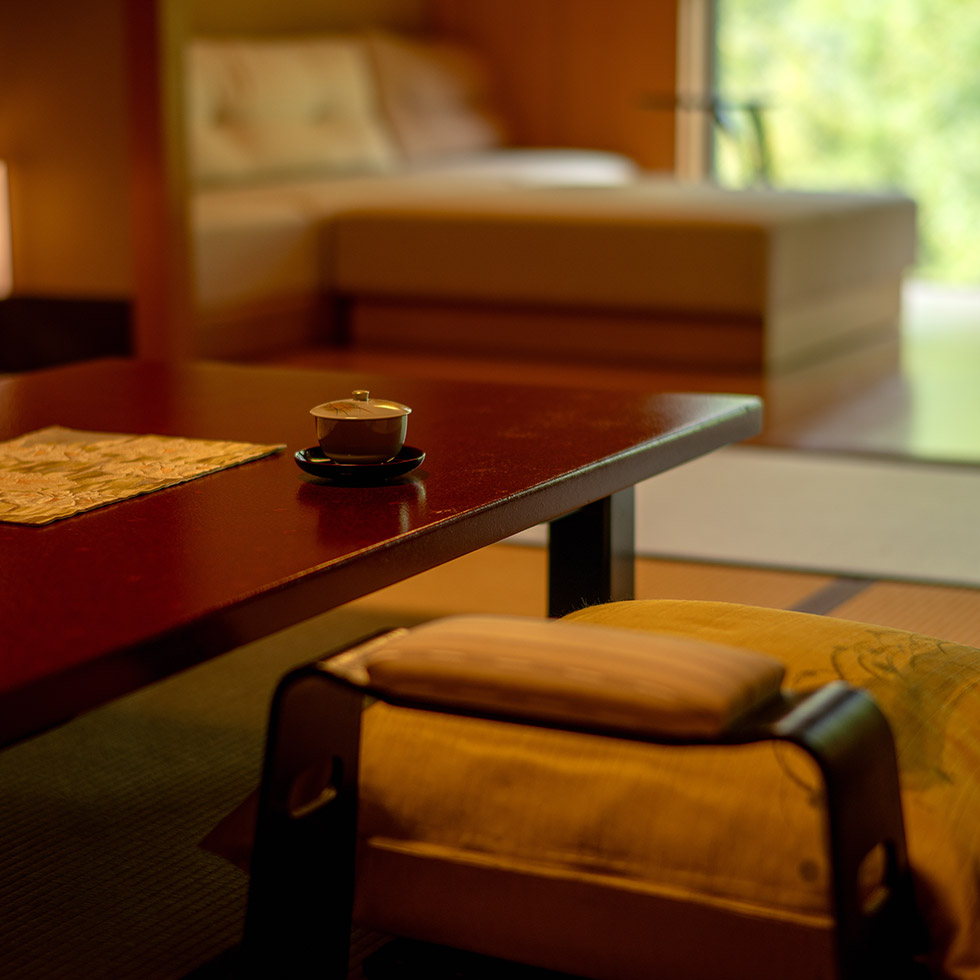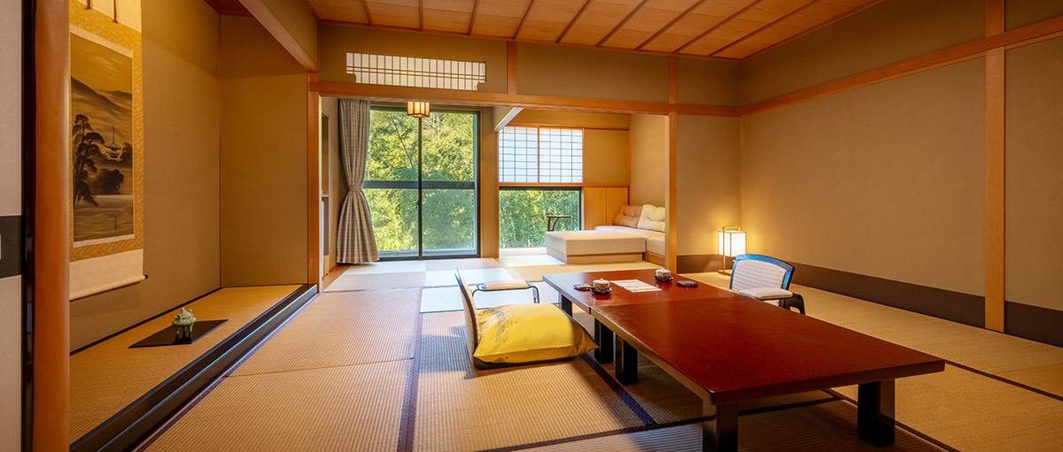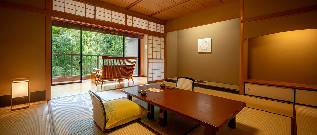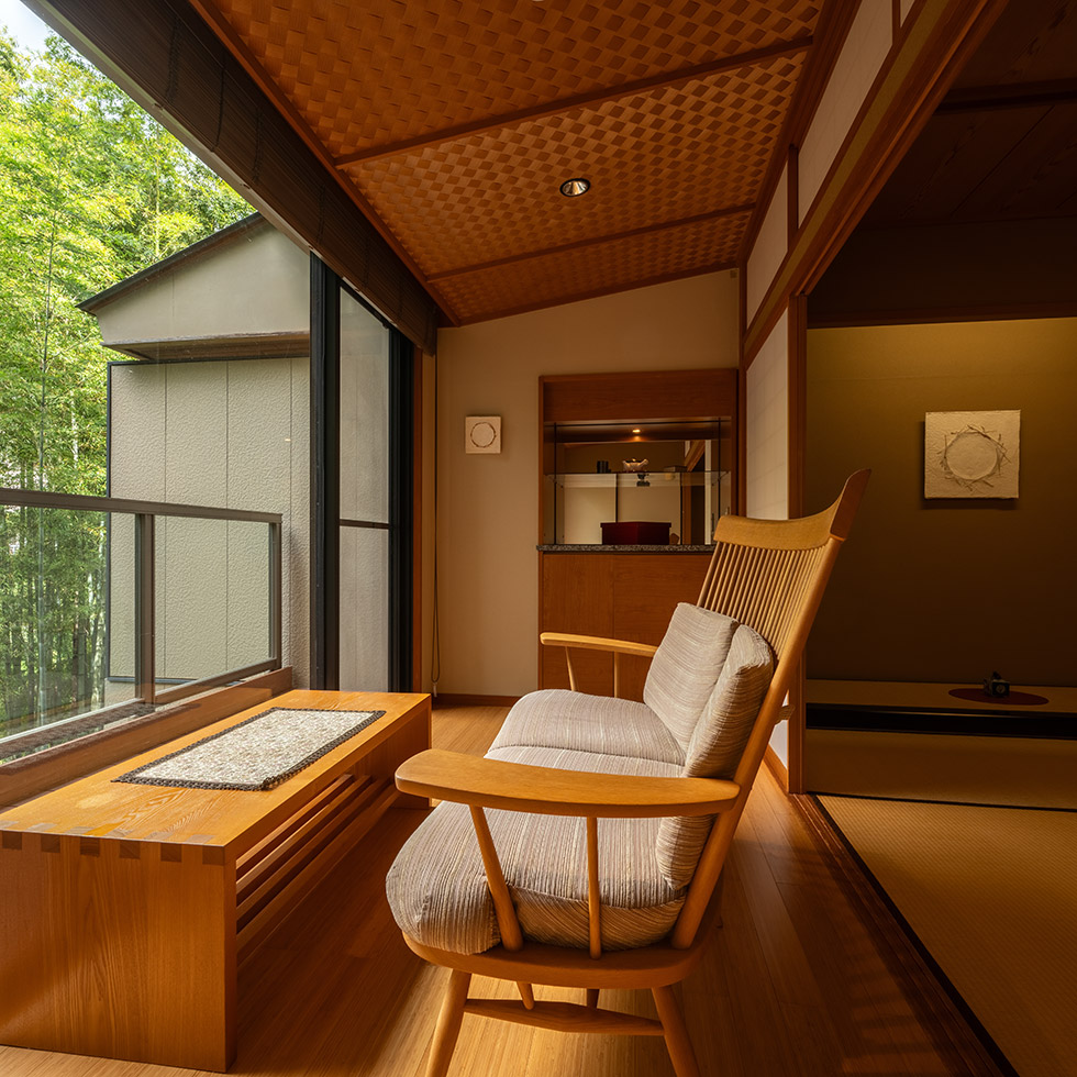渓流と竹林に最も近い1F客室が、テラス付和室となっております。
