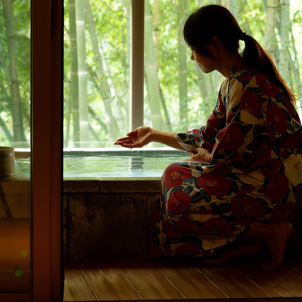 お部屋や露天風呂からは竹林がご覧頂け、鶴仙渓のせせらぎに癒されます。
