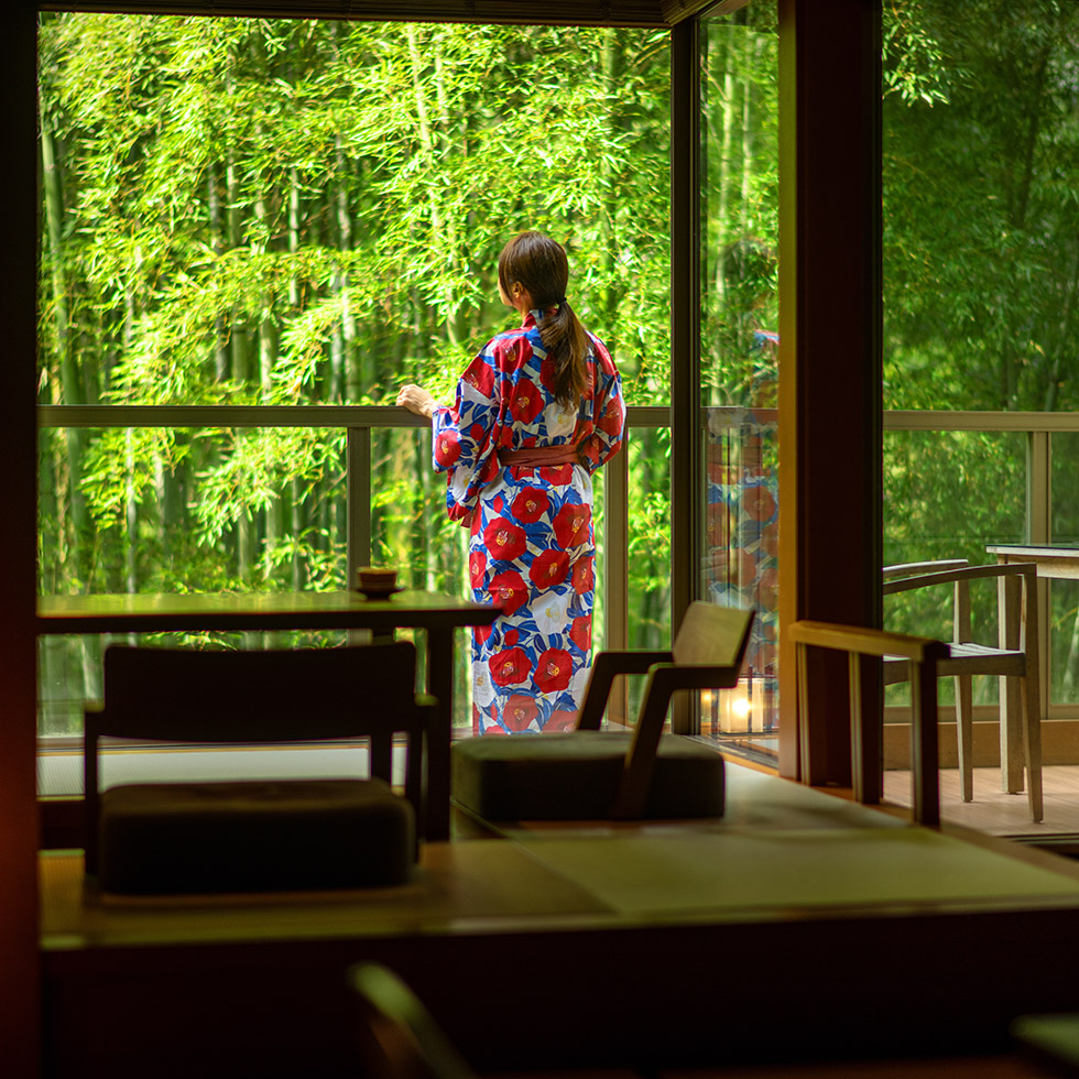 \山中温泉「厨八十八」では、全客室から竹林を眺めることのできるお部屋となっております。