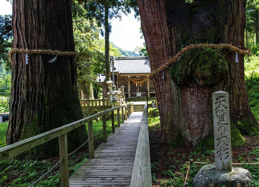 温泉街から南へ約2kmの菅原神社の境 内にある樹齢2300年と言い伝えられている御神木で、国の天然記念物にも指定されています。